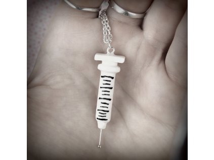 Náhrdelník se stříkačkou z polymerové hmoty (4,5cm), délka řetízku 48cm.