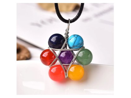 Přívěsek ve tvaru květiny ze sedmi čakrových minerálů. Pestrý, krásný a originální <3 Obsahuje koženkovou šňůrku.