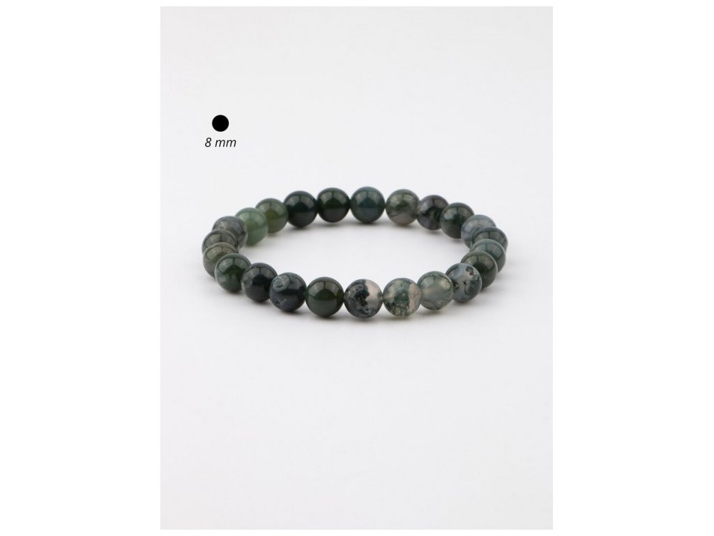 Elegantní náramek z korálků z achátu je skvělým doplňkem k jakémukoliv outfitu. Korálky o průměru 0,8 cm jsou navlečeny na elastanové niti, díky které je náramek velice pružný, dobře drží na ruce a tak samovolně nezklouzne. Obvod náramku je 18 cm. Je vhodný na všední nošení, ale také jako doplněk k šatům či ke kostýmku na společenské události. Díky mechovému zbarvení kuliček působí velice jemně a zároveň elegantně. Na ruce je velice lehký a dodá ženě eleganci a šarm. Náramek je vhodným doplňkem pro ženy s citem pro eleganci a oblibou jemných šperků. Jeho léčivé účinky ocení každá žena se zájmem o ezoteriku a alternativní léčbu.