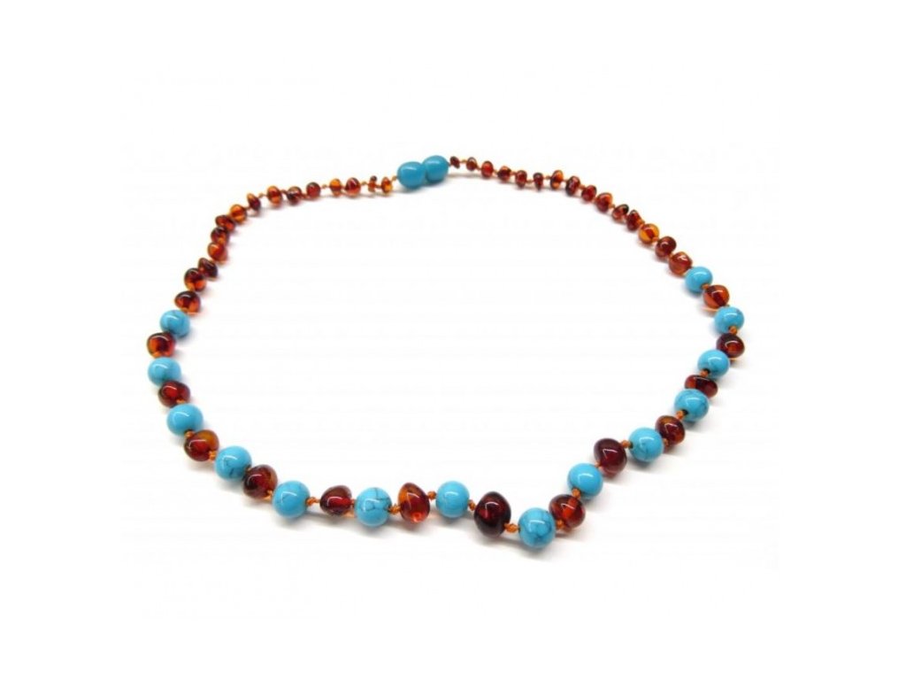Tento nádherný dětský náhrdelník kombinuje krásu a sílu dvou výjimečných kamenů: koňakově zbarveného jantaru a modrého tyrkysu. Jemná kombinace barev a léčivých vlastností dělá z tohoto náhrdelníku ideální dárek pro každou malou slečnu.