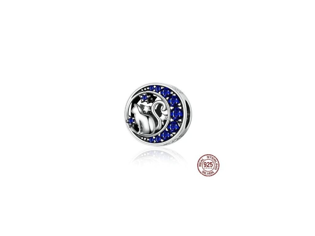 Korálek stříbrný na náramek s modrými zirkony Kočka