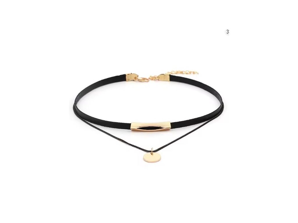 Choker náhrdelníky těsně obepínající krk jsou stále velkým hitem. Tento náhrdelník je z koženky v černé barvě se zlatým přívěskem.