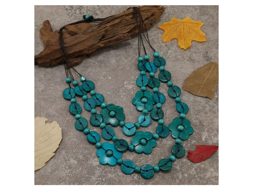 - Design: Náhrdelník je tvořen třemi splývajícími řadami různě tvarovaných korálků, které vytváří bohatý a plný objem.