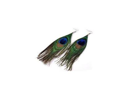 Visací náušnice peříčka vyrobené z látkových nití v designu pavích ok. Materiál: obecný kov, látka Délka: 16cm.