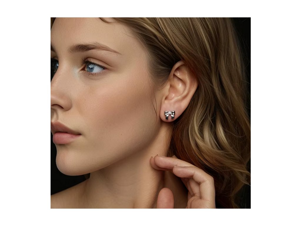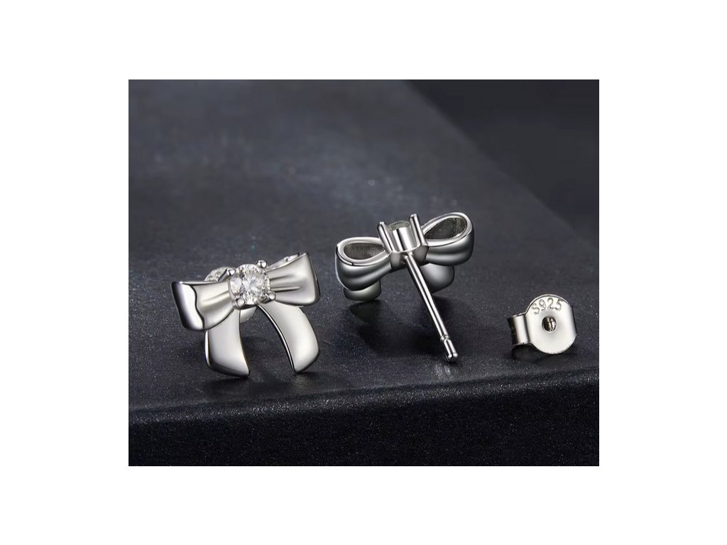 Zářivý detail: Střed každé mašličky zdobí precizně vybroušený čirý zirkon, který zachycuje světlo a dodává šperku luxusní vzhled.