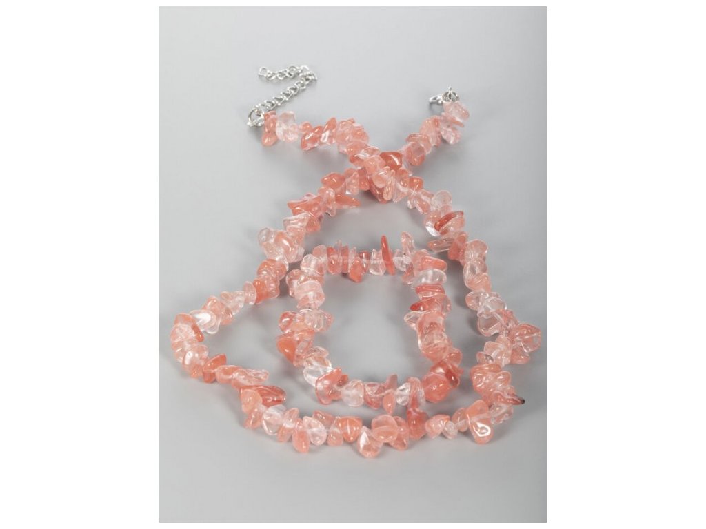 Luxusní sada náhrdelníku a náramku z broušeného jahodového křišťálu perfektně doladí jakýkoliv outfit. Obvod náramku je cca 19 cm, náramek je navléknut na pružné gumičce. Délka náhrdelníku je nastavitelná od 47 do 54 cm, zapínání je na karabinku, tento typ zapínání skvěle drží a tak náhrdelník samovolně nespadne. Po celé délce niti jsou navléknuty leštěné kamínky minerálu o velikosti kolem 0,5 až 1 cm. Zpracování působí opravdu moderně, vkusně a nadčasově.