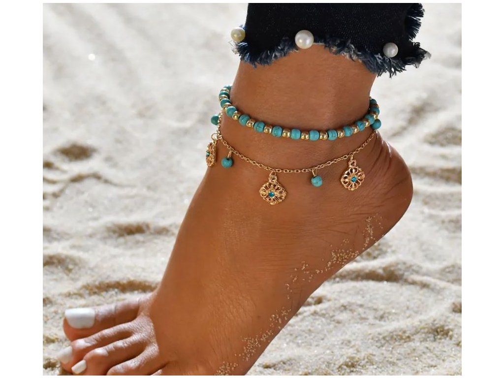 Náramek na nohu tyrkysový s přívěsky