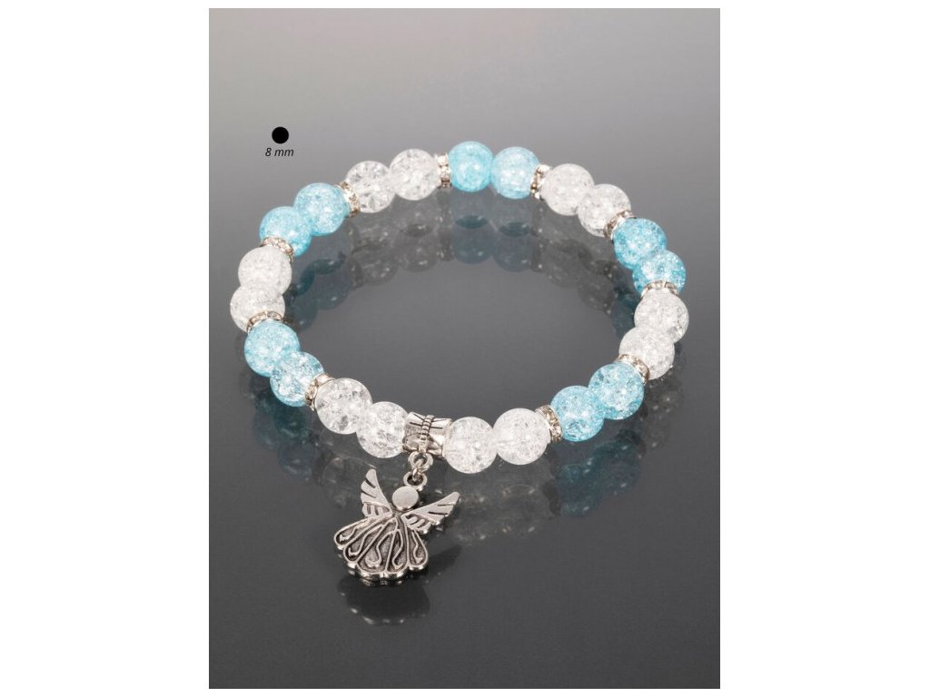 Náramek z pukaného křišťálu modré a bílé barvy s andílkem bílá