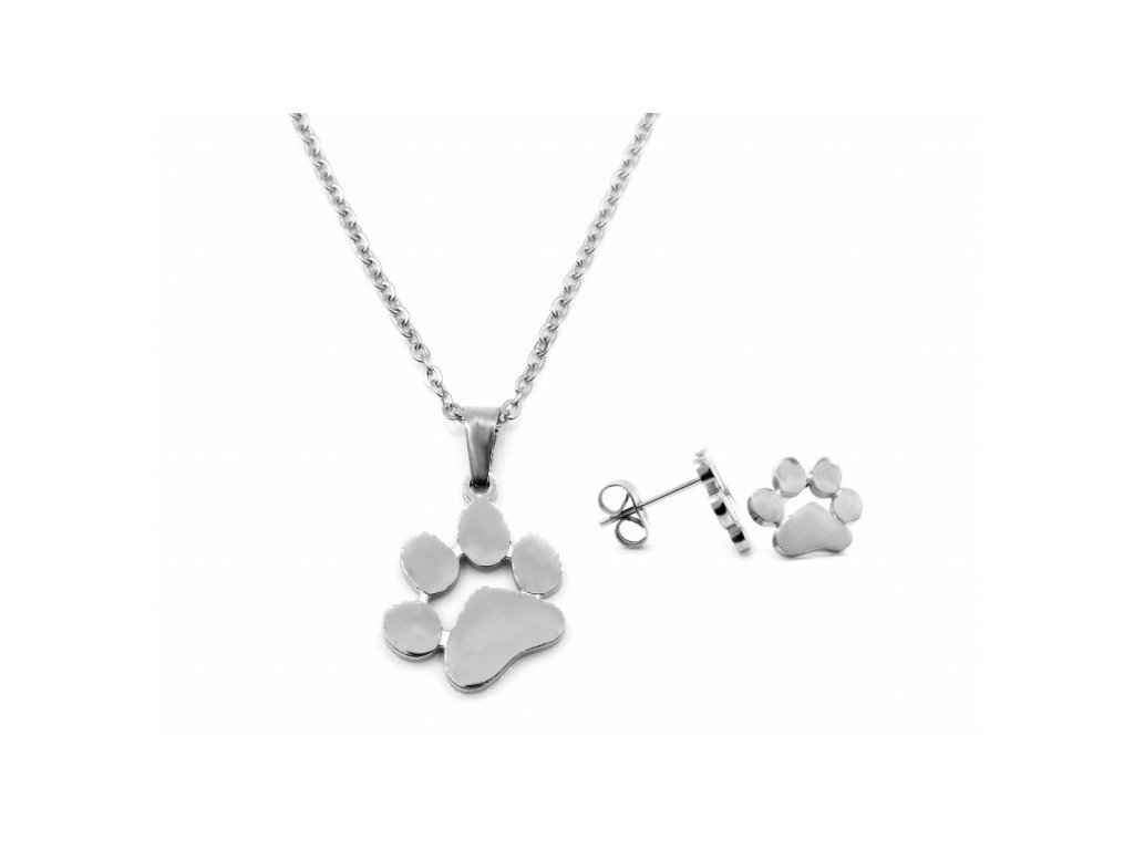 Krásná lesklá souprava ve stříbrné barvě z chirurgické oceli s tlapkami. Délka řetízku: 45cm. Průměr náušnic 1,3cm.