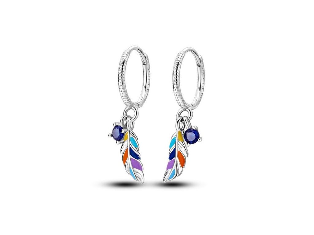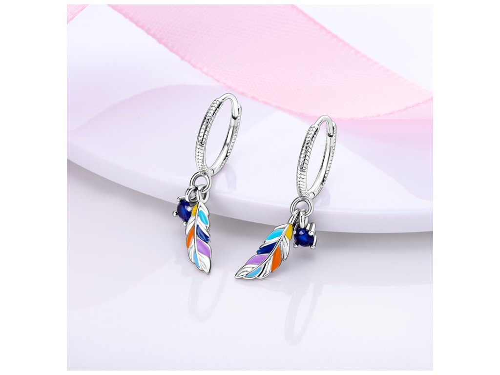Visací náušnice peříčka vyrobené z látkových nití v designu pavích ok. Materiál: obecný kov, látka Délka: 16cm.